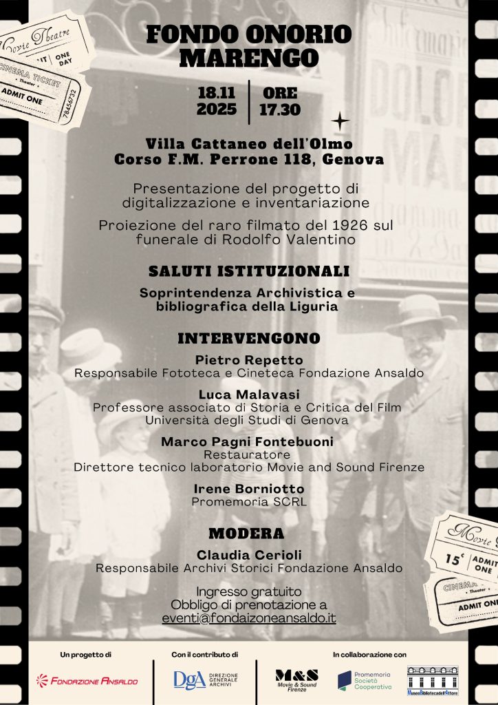 Martedì 18 novembre 2025 alle ore 17.30 presso la sede di Fondazione Ansaldo, a Villa Cattaneo dell’Olmo in corso Perrone 118 a Genova, si terrà la presentazione dell’intervento di schedatura, restauro e digitalizzazione del fondo Marengo, recentemente concluso, che ha ottenuto il finanziamento previsto dal Bando Progetti ricerca scientifica 2025 della Direzione Generale Archivi.