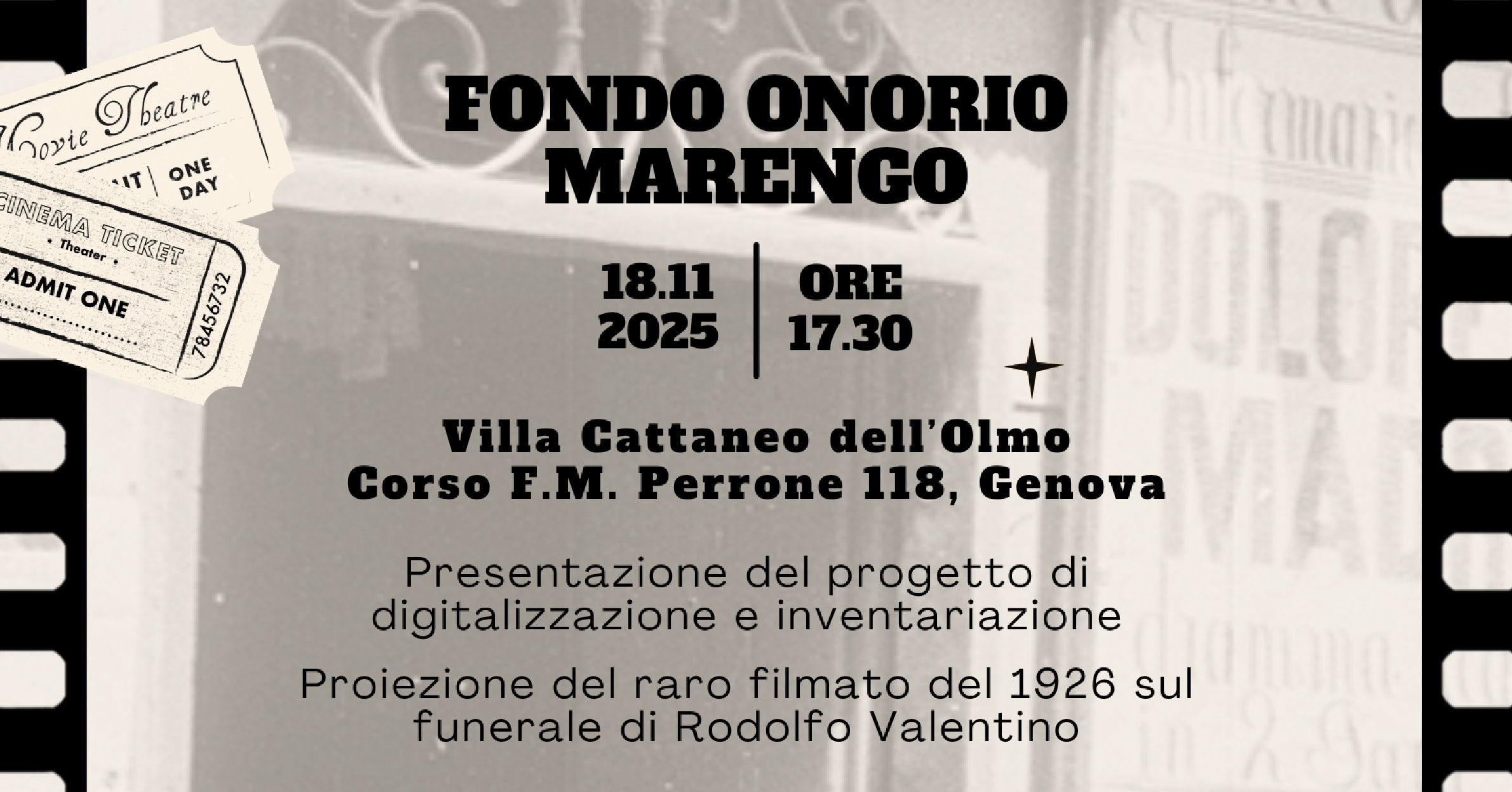 Il fondo filmico Onorio Marengo, acquisito in comodato da Fondazione Ansaldo nel 2022, è stato prodotto nel corso dell’attività del primo cinematografo di Genova-Sestri Ponente, operativo dal 1910 al 1927, e conserva materiali cinematografici fino agli anni Sessanta, entrati successivamente nella disponibilità della famiglia Marengo.